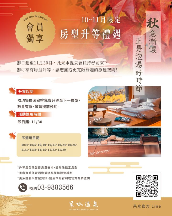 即日起至 11 月 30 日,凡呆水溫泉會員持券前來,即可享有房型升等,讓您擁抱更寬敞舒適的療癒空間!