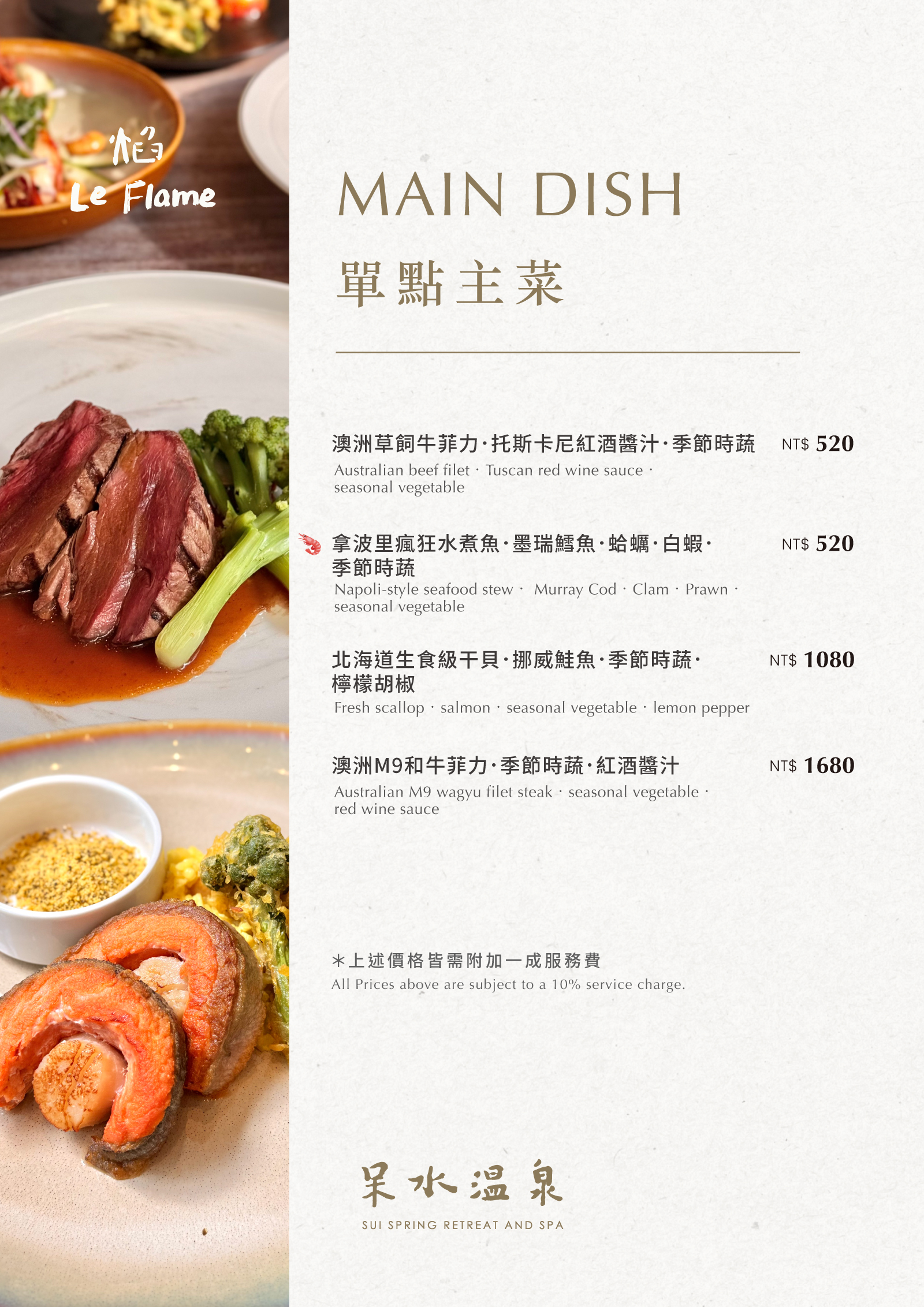 焰餐廳的全新午間單點菜單內容,可參考本文連結,有關呆水溫泉會館各種季節性泡湯產品,可直接向本會館洽訂,相關細節與各種湯屋與餐飲服務、體驗行程,請致電03-9883566或洽官網、社群網站。