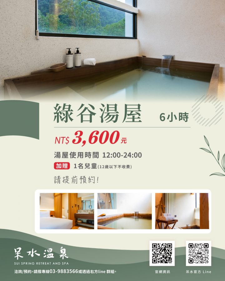 ▍欲知詳情請洽呆水溫泉,專案洽詢預訂專線:+886 3 988 3566、+886 965 014 510 email 洽詢:service@suispring.com ※呆水溫泉保留收回、更改及修改使用方法之權利,不另行通知。